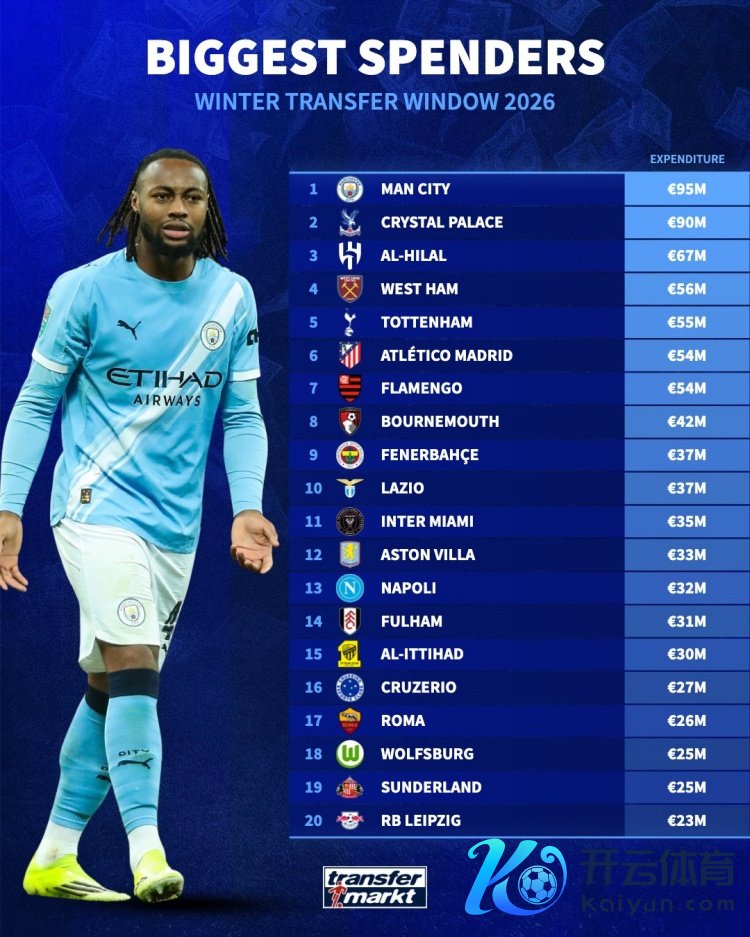 2月4日讯 冬季转会窗依然关闭,德国转会市集清点了足坛各队引援铺张情况,曼城以9500万欧居首,水晶宫以9000万欧位居次席。