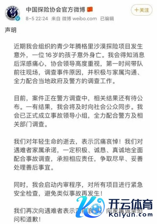 国度体育总局天然暂停了谈判体育行径,但一些小畛域的探险行径并不受这一禁令的统率。没念念到,悲催就这么发生了。本年 7 月 29 日,别称 16 岁的北京高中生在参加沙漠探险形势时命丧腾格里沙漠。“中国探险协会官方微博” 近日发表声明称,近期该会组织的沙漠探险形势发生不测,一位 16 岁的孩子身一火,当今警结净在拜访。协会官网先容,该协会设置于 1993 年 3 月,是中国探险的行业协会与最高组织机构。