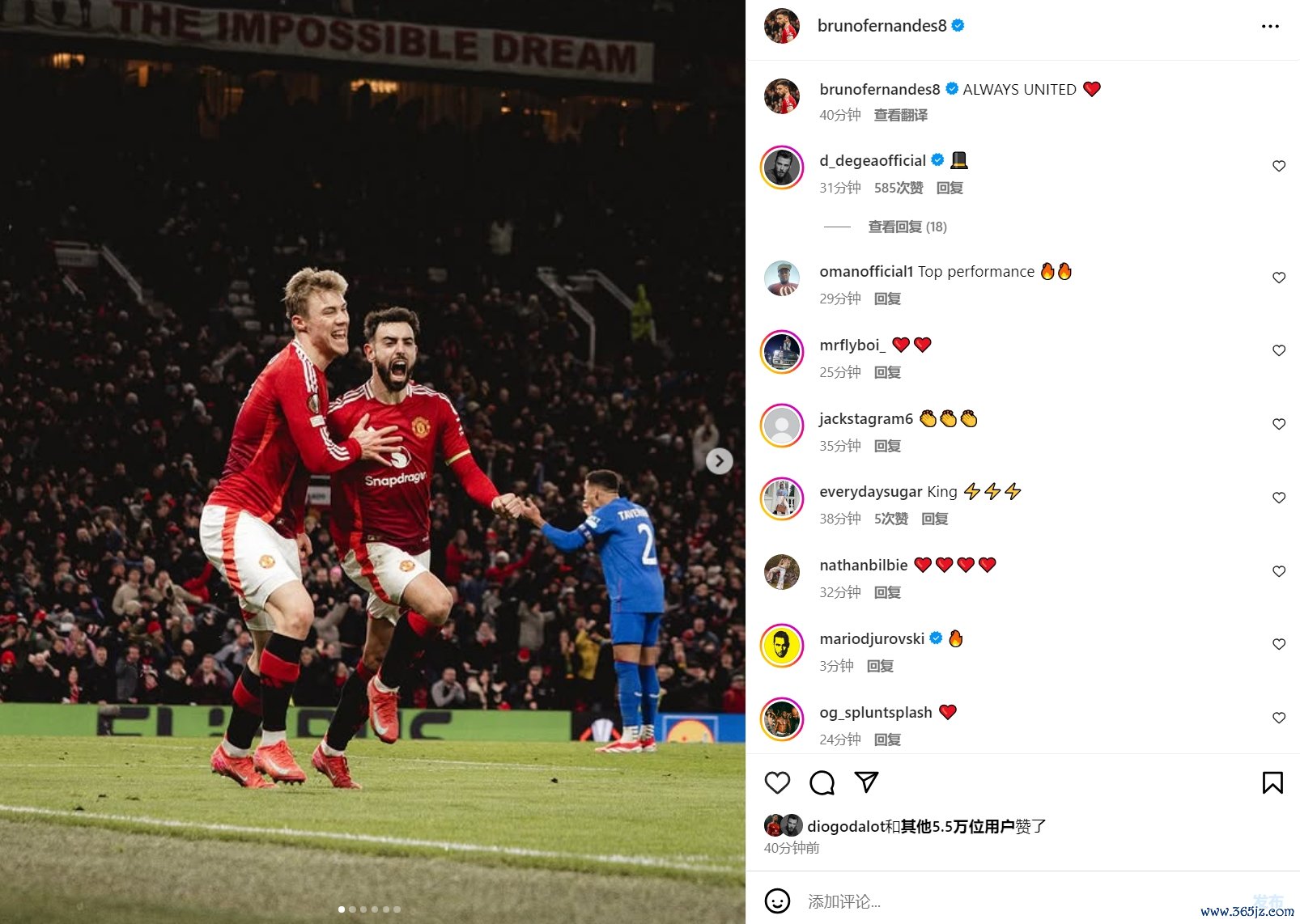B费在酬酢媒体上晒出庆祝进球的像片,配文:“永远合作一致。”(双关永远曼联)