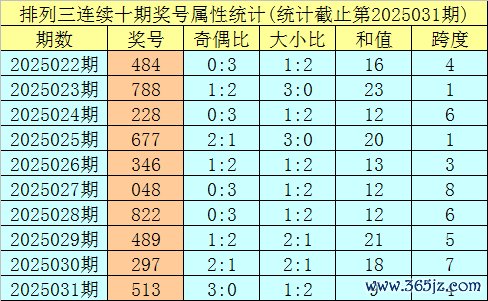 上期总结:陈设三第2025031期奖号:513。类型:组六,奇偶方式:奇奇奇,大小方式:大小小,和值:9,跨度:4。
