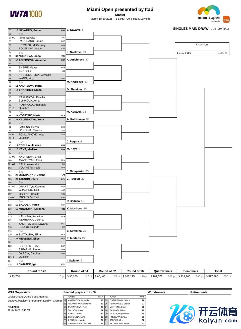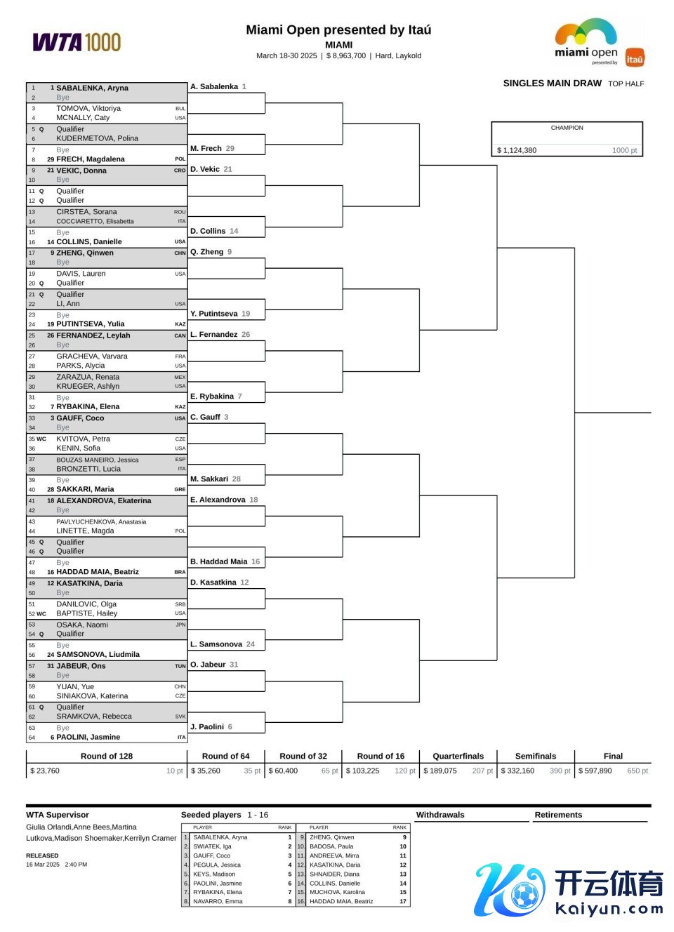 北京时期3月17日凌晨,2025年网球迈阿密专家赛女单签表出炉,9号种子中国选手郑钦文碰到“地狱”级签表,与莱巴金娜萨巴伦卡同在上半区,若是能最终夺冠,可能需要连赢寰球前3的能手。