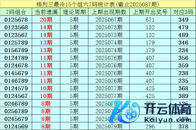(2)在陈列三第2025087期奖号中,最冷的7码组六遗漏20期,在这20期奖号中,组六号码开出15期,出现概率为75%,半顺组合开出8期,含1期全顺组合,开出概率为40%;杂六组合开出7期,开出概率为35%。