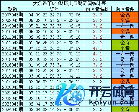 后隔离析:在第043期历史同时开奖中,后区奖号奇偶比为17:19,最近5年同时后区奇偶走势为:一奇一偶、一奇一偶、一奇一偶、一奇一偶、全奇,本年同时展望奇偶号码同出,关爱两码01、04。