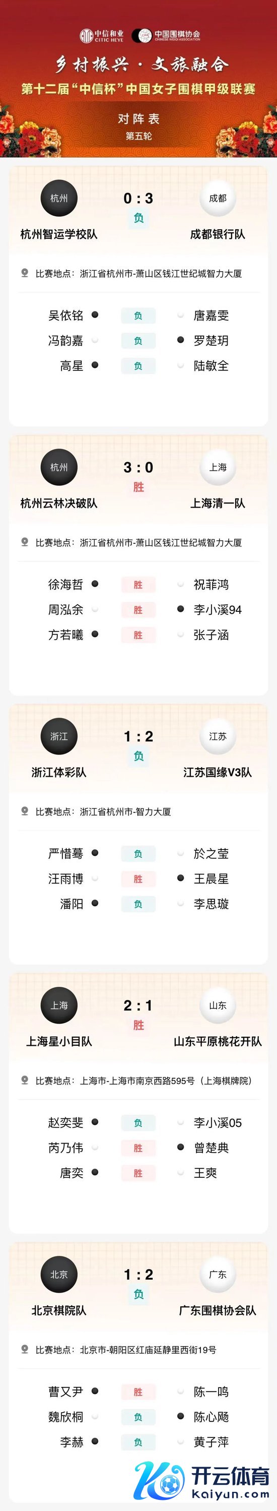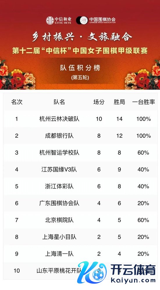 第十二届“中信杯”中国女子围棋甲级联赛第五轮6月23日在北京、上海、浙江杭州三地按捺。由周泓余、方若曦、徐海哲构成的杭州云林决破队主场3比0完胜上海清一队,积10分独自领跑。
