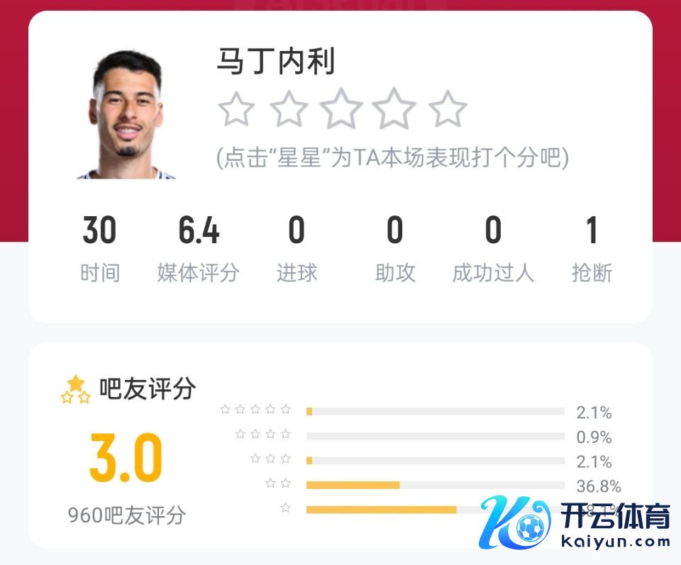 英超第15轮,阿森纳1-1战平富勒姆。马丁内利替补出战发达欠安,赛后吧友评分仅为3分。这也曾不是他本赛季第一次被打低分。