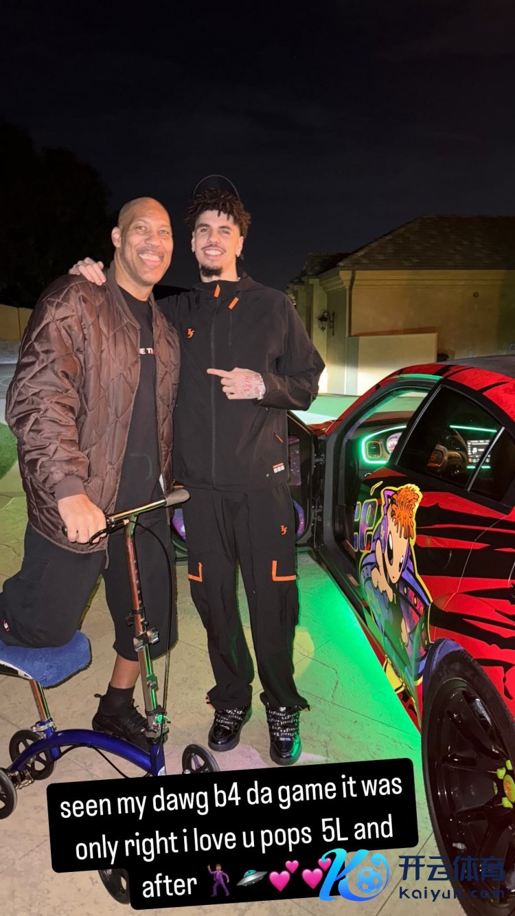 本日球爹的三男儿拉梅洛-鲍尔更新IG晒出我方与父亲的合照,合照中二东说念主笑貌满面体育集锦,三球写说念:“赛前见到我老爹了,理所诚然地说我爱你,耐久爱你。”