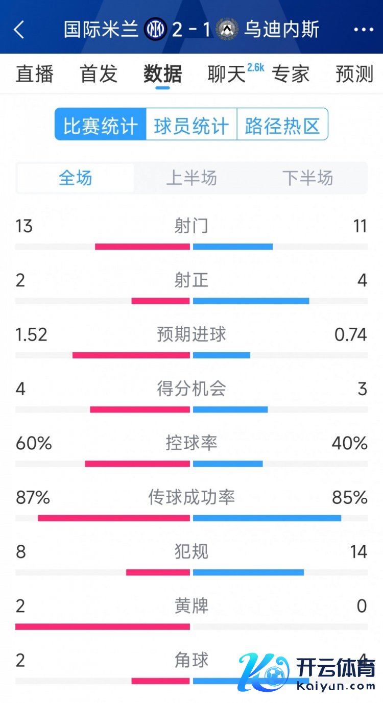 3月31日讯 在本轮意甲,国米2-1打败乌迪内斯,以下为两边全场数据对比: