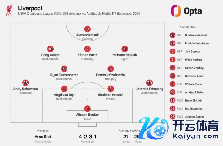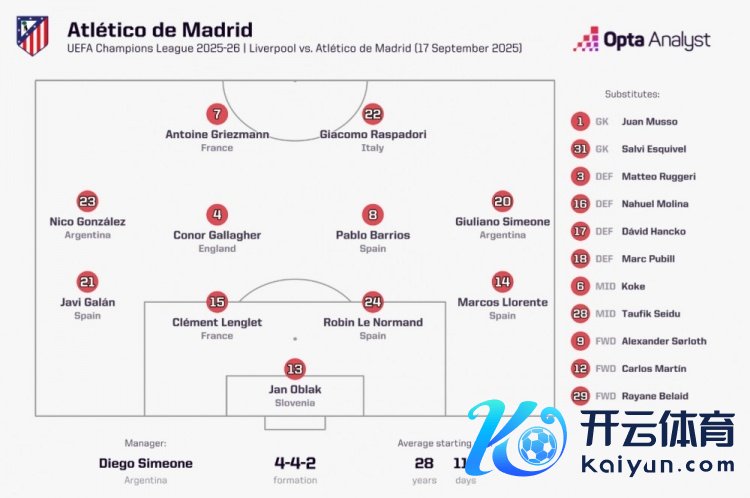 9月18日讯 欧冠联赛阶段首轮比赛,利物浦在安菲尔德迎战马竞。本场比赛的首发现在照旧出炉,利物浦方面莫得英格兰东说念主参加11东说念主威望,而马竞方面有1名英格兰球员参加首发威望,那便是加拉格尔。