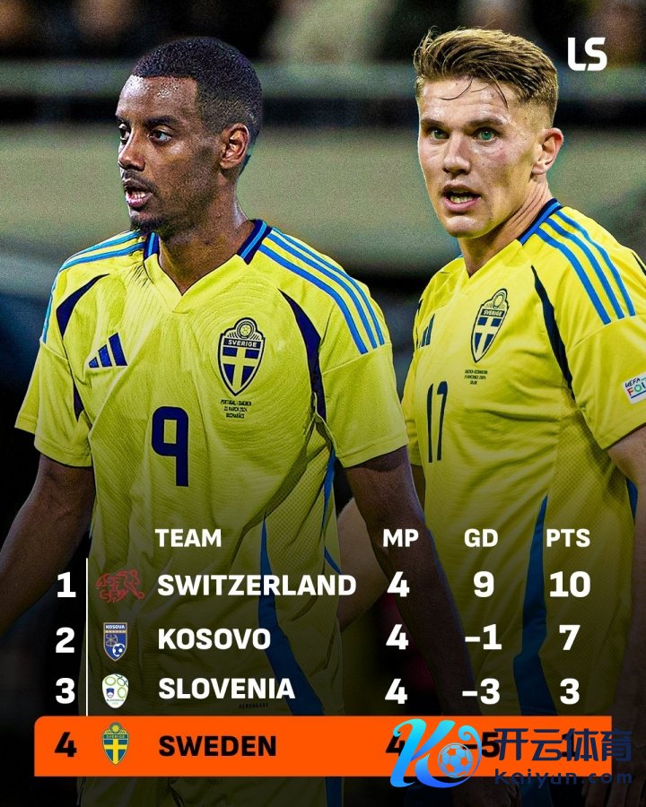 瑞典世初赛已4轮不堪,且在领有总身价1.95亿的两大神锋伊萨克和约克雷斯的情况下,近3轮都未攻获进球,现在暂以1分垫底,过时榜首瑞士9分,过时第2的科索沃6分。