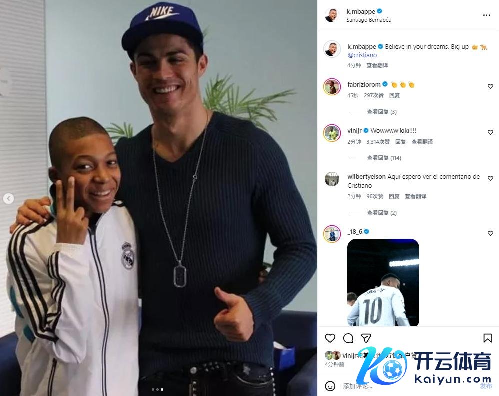 赛后,姆巴佩更新社媒,发布了本场比赛我方进球后效法C罗庆祝的图片和我方少年时与C罗的合影,并配文谈:“深信你的空想。致意王者。”