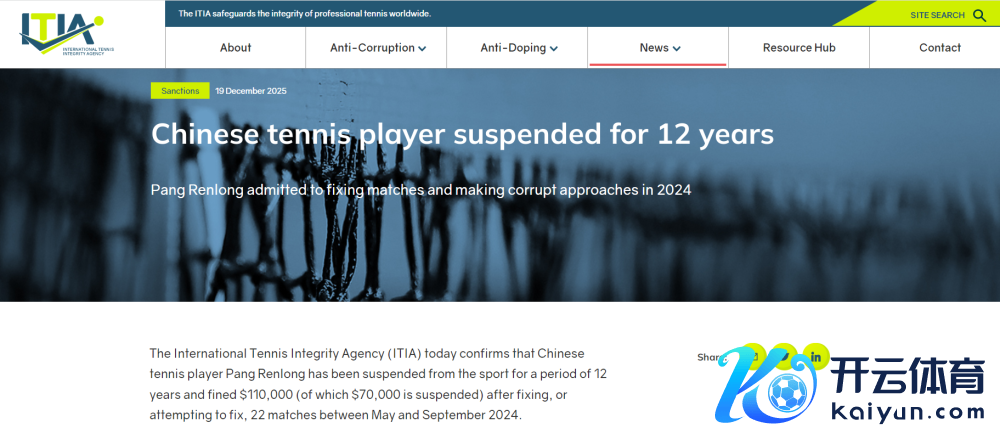 北京时期12月20日,据新华社报谈,外洋网球诚信机构(ITIA)阐发,中国网球畅通员逄仁龙因主宰或企图主宰比赛,被处以禁赛12年并罚金11万好意思元(其中7万好意思元暂缓推论)的处罚。