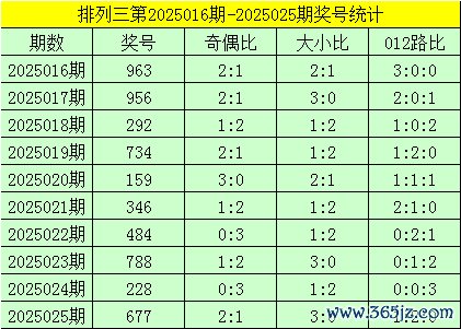 开奖回想:摆设三第2025025期奖号为:677,其奇偶比为2:1,大小比为3:0,奖号012路比为1:2:0。