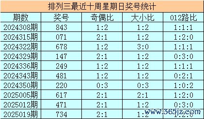 3.号码012路比为6:9:6,0路号码走冷,本期号码012路比参考2:0:1。