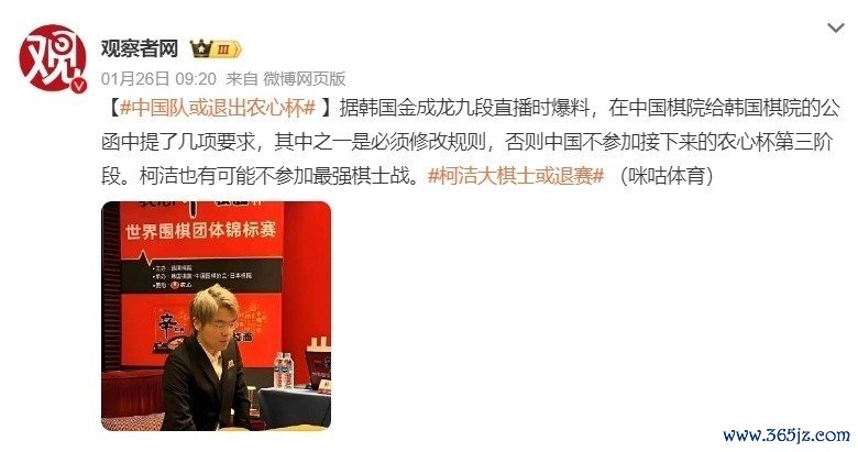 何况在柯洁背后,除了有多量中国网友抒发对他的救助除外,还有中国围棋国度队的强势表态,据《不雅察者网》报说念,韩国金成龙九段直播时暴露,中国棋院已向韩国棋院发出公函,内部提到了几点条目,其中一项即是“必须修改围棋全国大赛王法”,更紧要的是,中国队还忽视,若是不接待条目,那么将退出接下来的农心杯第三阶段,这是由韩国举办的全国上水平最高的围棋团体赛,何况柯洁也有可能退出最强棋士战