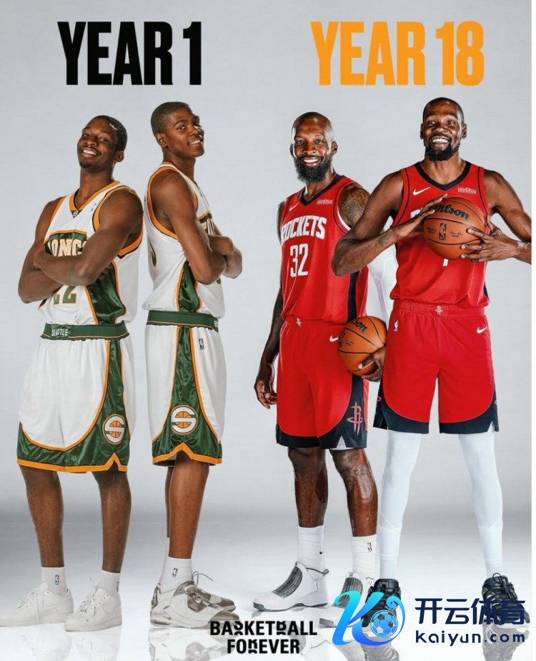 10月1日讯 今天,好意思媒BasketBallForever晒出了杜兰特与杰夫-格林的少壮赛季定妆照,并与本年两东谈主的定妆照作念了对比。