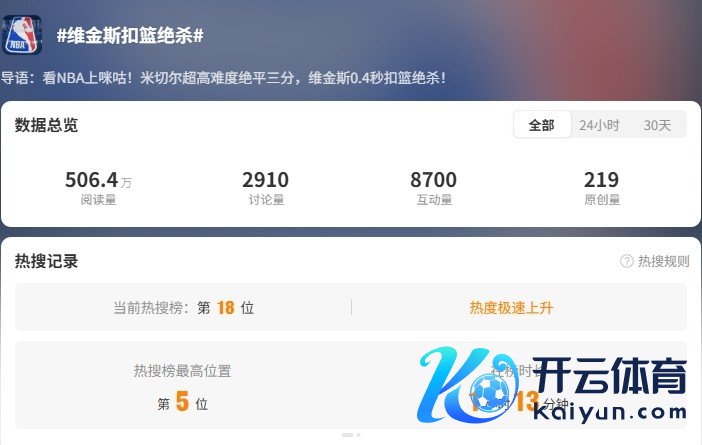 赛后,“维金斯扣篮绝杀”词条一度来到热搜第5位。