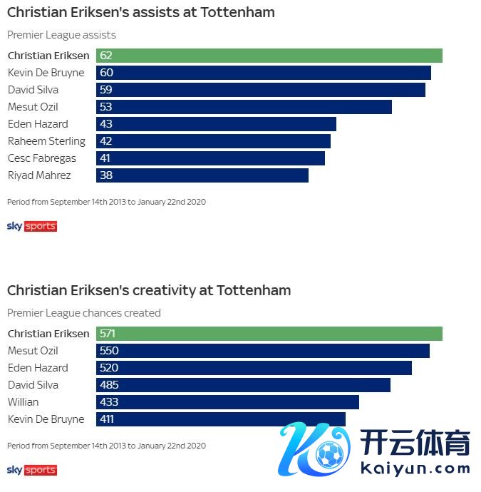 在热刺的巅峰时期,埃里克森不仅作念到了这些,还展现了更多——他号称英超联赛中最出色的创造力泉源。这样的说法看似斗胆,但数据足以佐证:在热刺遵守期间,这位丹麦中场的助攻数和创造机会数均位居联赛第一,同期禁区外进球数也特出了其他任何英超球员。