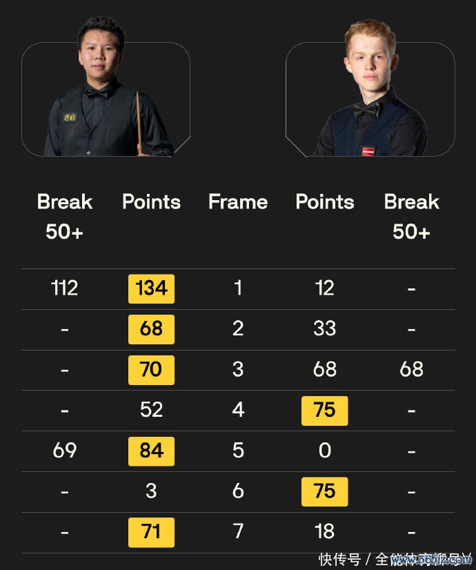 第二局,周跃龙过程上一局稳妥赶快找到垂死手感,他轰出单杆116分,116-0零封霍金斯,1-1扳平比分。第三局,周跃龙进一步进步垂死手感,他轰出单杆126分,131-0零封霍金斯,2-1反超比分。