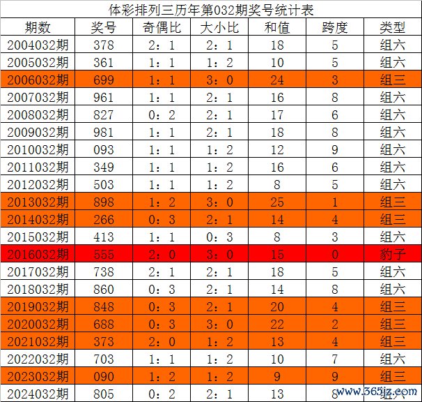 在积年陈设三第032期开奖中:次豹子号码出现1次,组三号码出现7次,组六号码出现13次。组六号码出现比例略高,本期奖号模式参考:组六号码。
