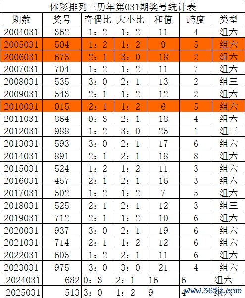 陈设三第2025031期奖号为513,奇偶比为3:0,大小比为1:2,和值为9,跨度为4。
