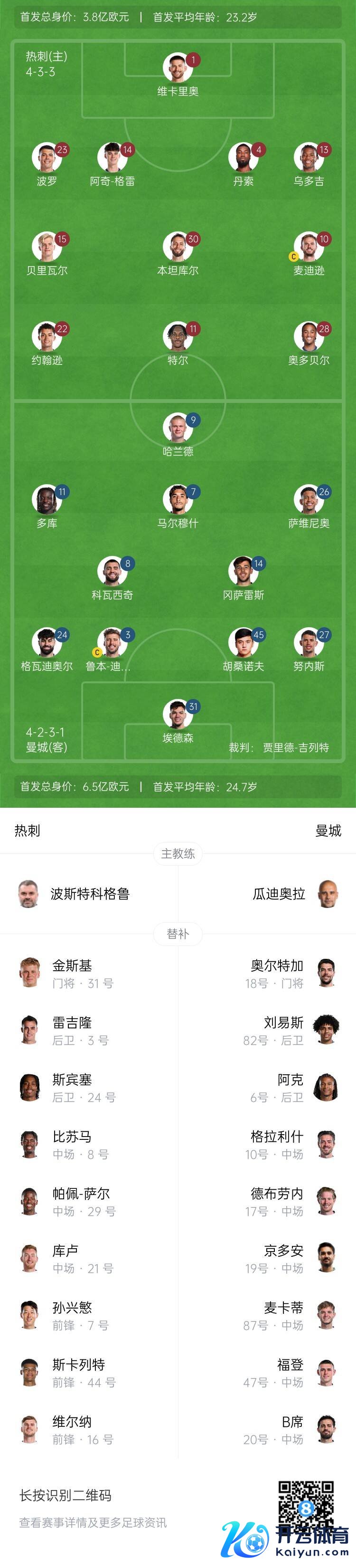 2月27日讯 英超第27轮,热刺主场对阵曼城。赛前,官方公布了本场的首发名单。