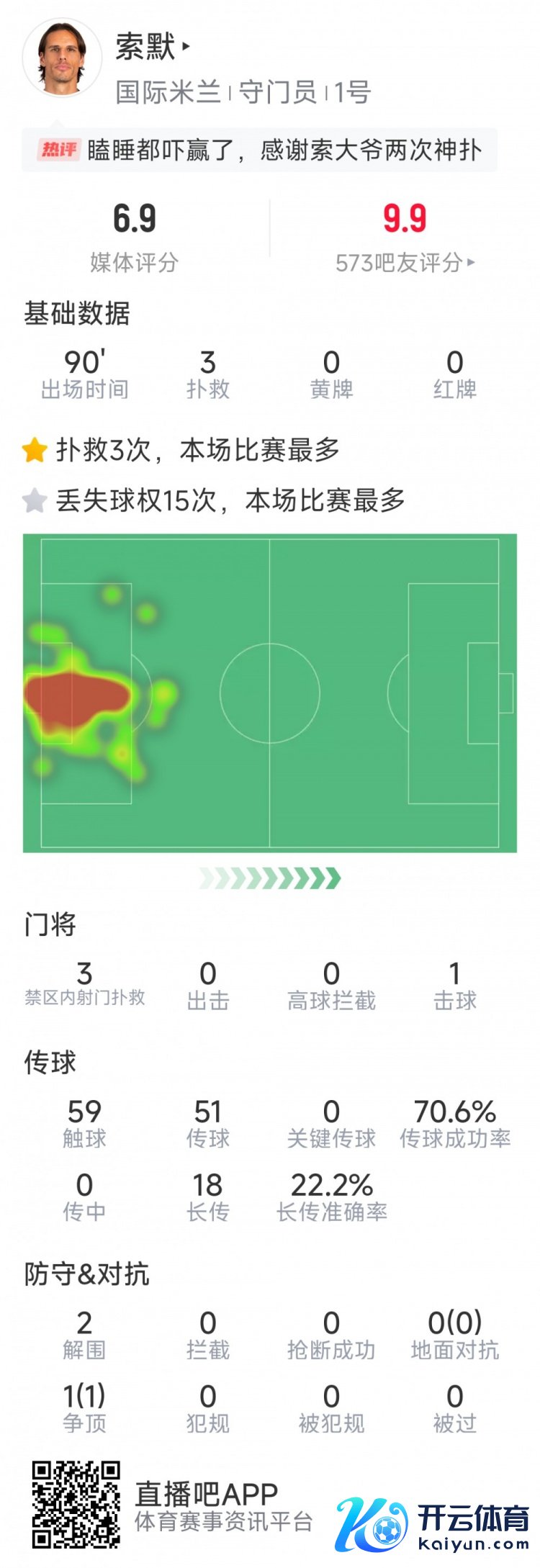 本场比赛国米门将索默阐扬出色,孝敬3次要津扑救体育赛事直播,59次触球,传球得手率70.6%。